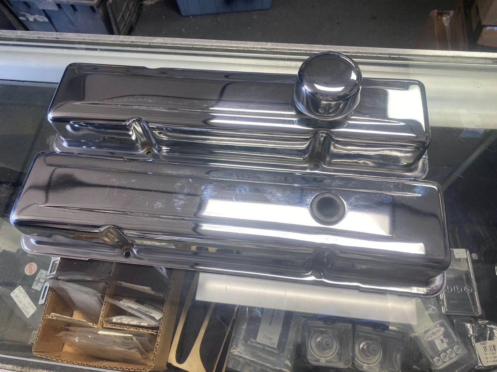 These are New Old Stock Hi Quality Valve Covers made in Taiwan real good chrome!