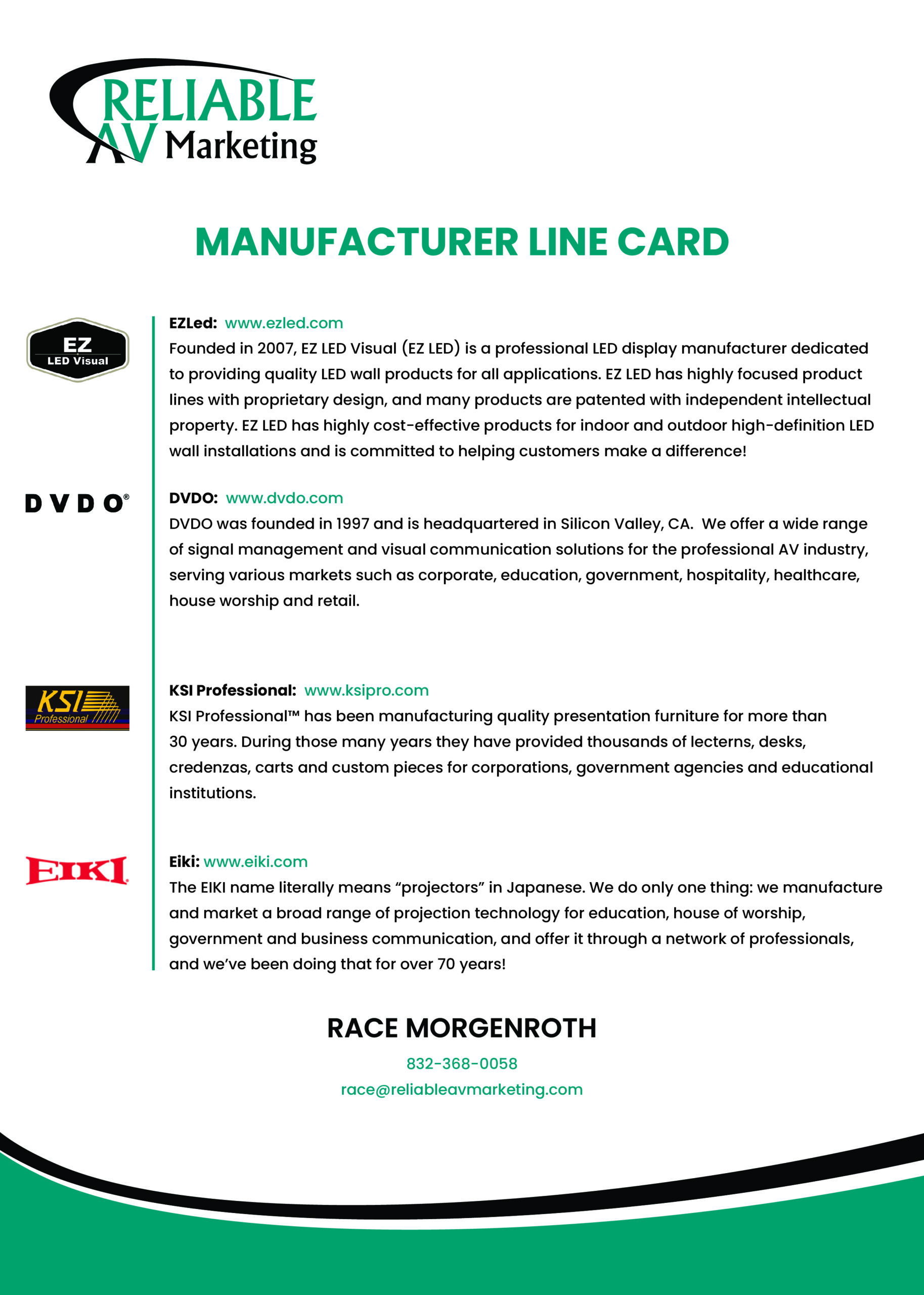 At Reliable AV Marketing, we specialize in creating smart, efficient, and highly targeted distribution channels for the professional AV industry. Our approach is built on decades of experience and a deep understanding of what drives dealer success.